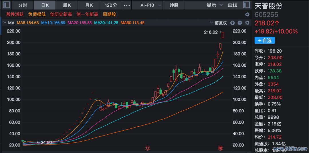 12月30日,天普股份(605255)股价再度涨停,收于218.02元/股,再创历史新高。