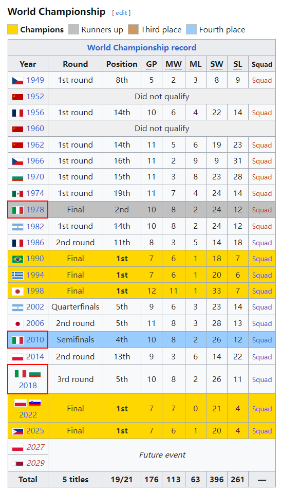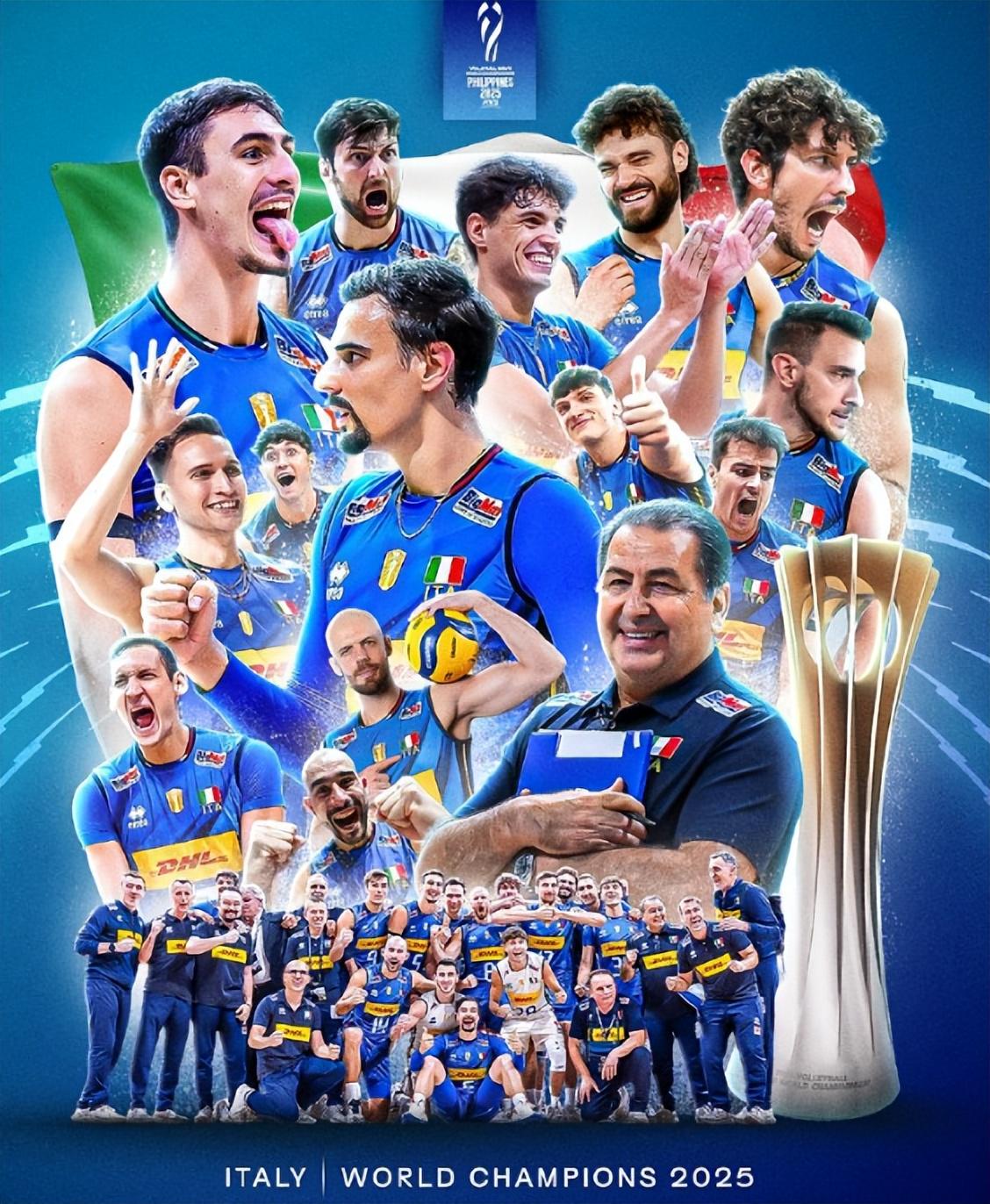 2022年世锦赛意大利男排就是冠军,2025年完成卫冕,队史(1990、1994、1998、2022、2025)五个冠军,也是队史第六枚奖牌,在1978年还拿过一次银牌。