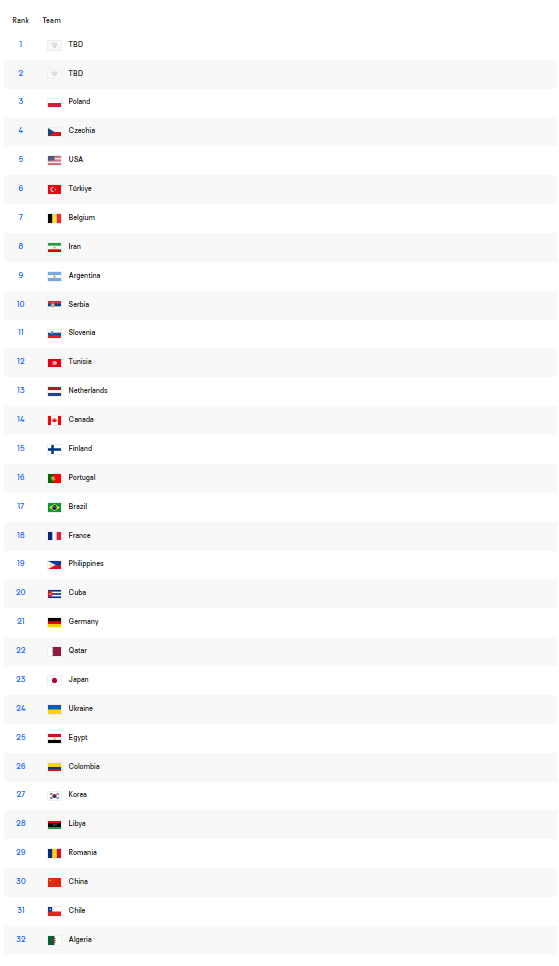 早些时候3-4排位赛已经打完,波兰男排3比1击败捷克男排,四局比分:25-18、23-25、25-22、25-21。换言之波兰男排是这一届世锦赛的季军,捷克男排是第四。